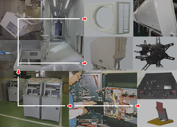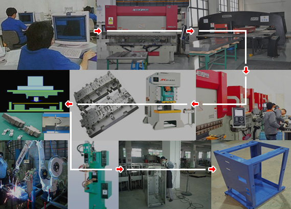 開發&設計 → 激光加工 → 轉塔數沖 → 折彎 → 模具沖壓 → 焊接裝配 → 打磨 → 清洗 → 涂裝 → 組裝 → 檢查 → 成品…
